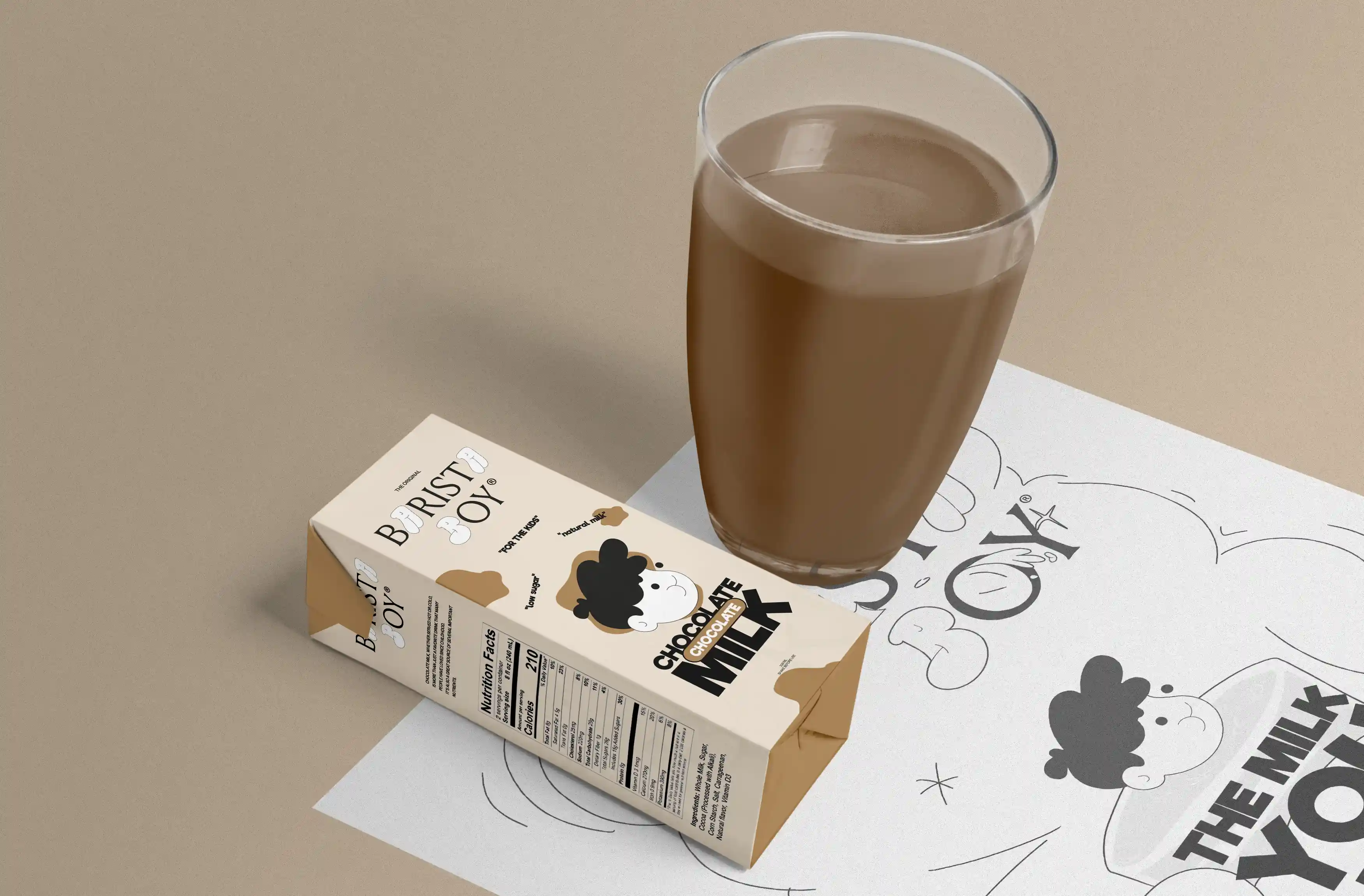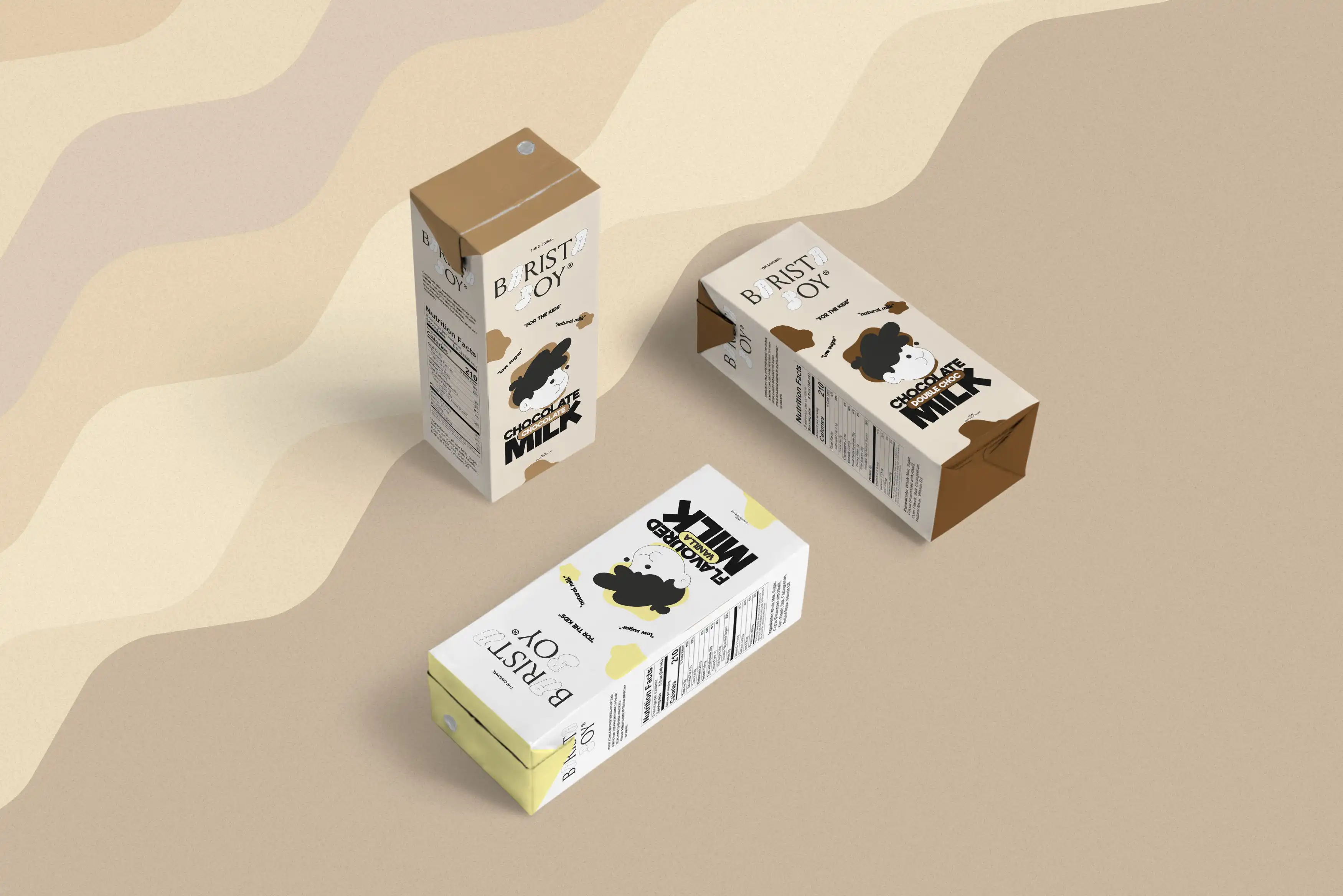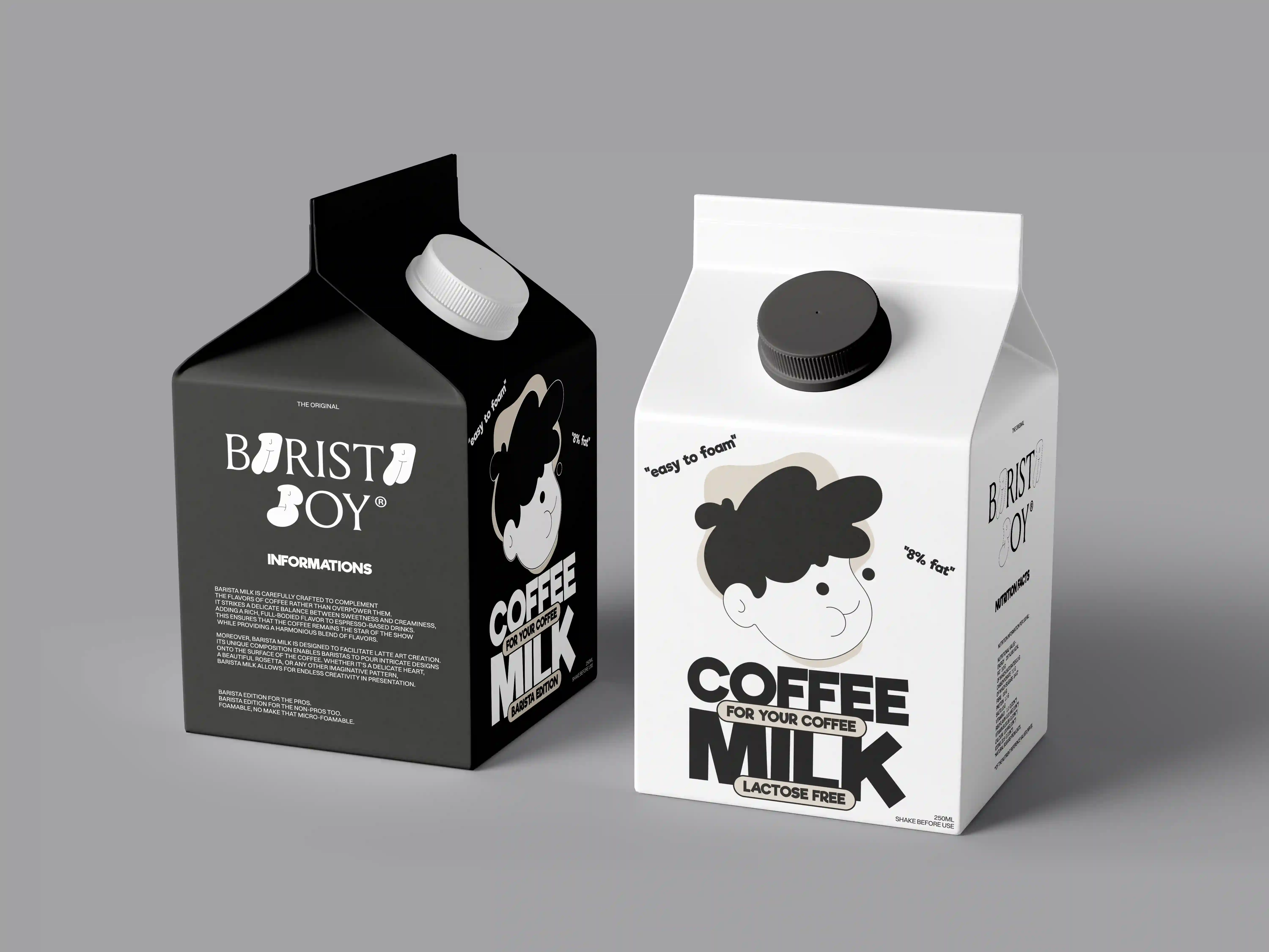 I aimed for a minimalstic, playfull & modern asthetic. To make the product stand out better, (in the shelf) I placed the face in the middle and large, a good example is down below. A "splash" was placed in the background to make it easier to distinguishwhether it is an espresso (brown), iced coffee (blue) or what flavor the children’s milk is intended for. For the premium products i chosed "black" as the primary color, wich should emphesize "quality & professionalism". It also increase the confidence of the product itself.